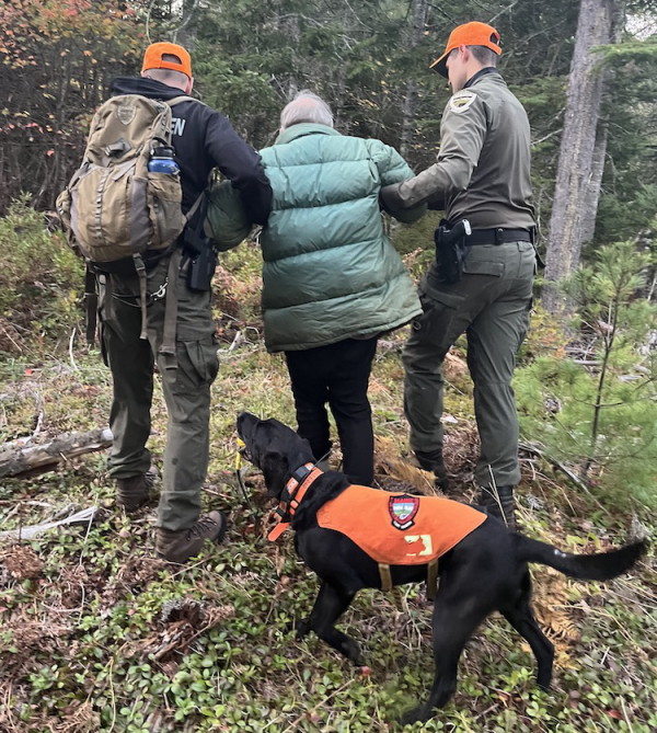 Game Wardens and members of the Sheriff’s office and the Edgecomb Fire Department searched the area, and at approximately 5:40 p.m., Game Warden Robertson and K9 Storm located Thompson in the woods, disoriented, and sitting on a stone wall with one shoe missing. Game Wardens and other assisted getting Thompson out of the woods as his knee was hurting, and he was loaded onto an ATV, and brought out to a waiting ambulance where he was examined but not transported by emergency medical personnel, and then released to his family.