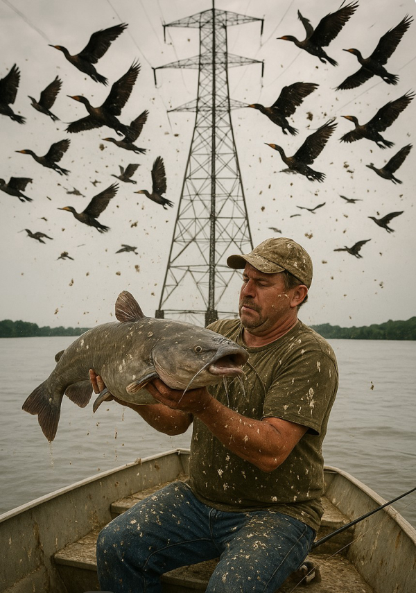 Fishing under the cormorants for big Tennessee River catfish is not for the squeamish—but it’s effective. (ChatGPT)