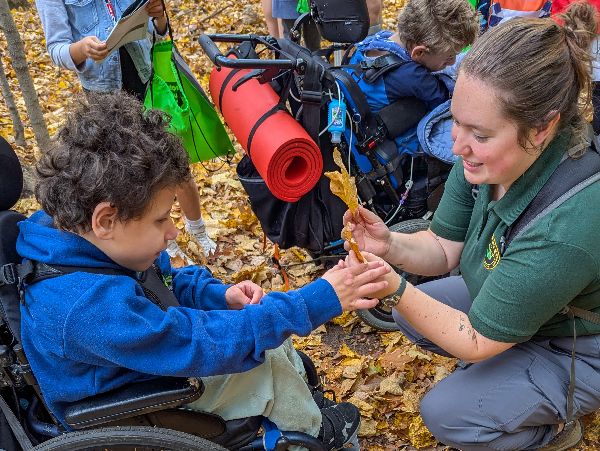 A Michigan Department of Natural Resources educator assists a student in a wheelchair during a hands-on activity involving leaf observations.