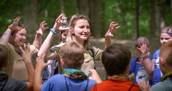 Students follow along with a Michigan Department of Natural Resources educator during a sensory warm-up.