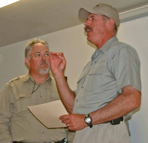 Our very own Rich Grassi, seen here during a Gunsite class, notes “Larry Mudgett somberly informing the 250 class that even I passed the course.” Photo courtesy of Rich Grassi