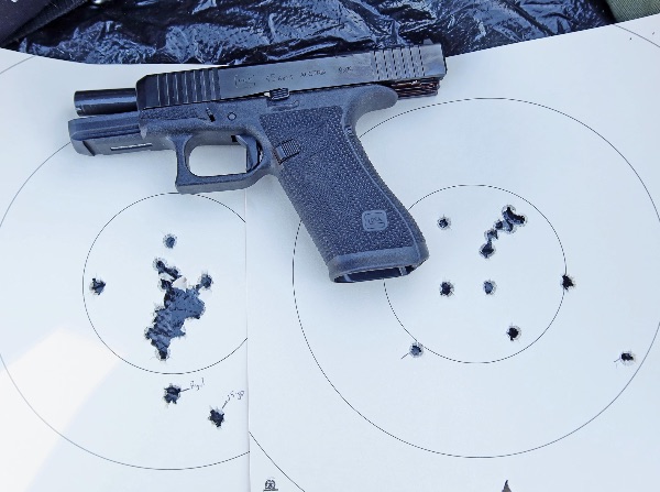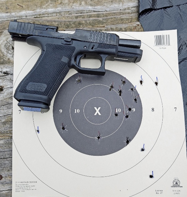 While my 57/100 slow fire was miserable (that scoring is tight), I shot a 90/100 timed fire. With that “warmup,” I shot the Gen6 G45 bullseye style. I had a full 17-round magazine and shot on a B-8 repair center.