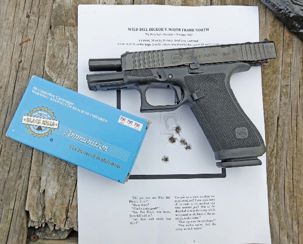 I started out with the D-1(c) repair centers for the NRA D-1 targets used in the GLOCK Shooting Sports Foundation gallery courses. I shot a short (15 yards and in) target and a long line (25 yards) target separately. These were the first rounds out of the gun. I shot in the 10-rounds/15 second cadence, starting from low ready, as in a GSSF match.