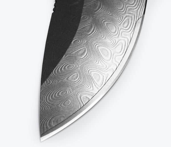 Despite being designed to be so purpose-driven, this knife is gorgeous. The handle is a lightweight wood that fits comfortably in the hand. The blade has a Damascus steel finish clearly conveying its strength and durability while also being beautiful. The sheath is a sueded leather stitched on the edges with leather lacing with a belt loop to keep it in close reach without it getting in the way.