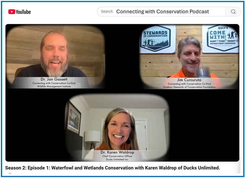 The Connecting with Conservation Podcast hosts, Dr. Jon Gassett of Wildlife Management Institute (WMI), and Jim Curcuruto of Outdoor Stewards of Conservation Foundation (OSCF) welcome guests Karen Waldrop, Chief Conservation Officer at Ducks Unlimited and Chuck Sykes, Director of Alabama Department of Conservation and Natural Resources on newly released episodes of the Connecting With Conservation Podcast.