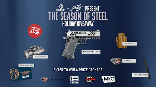 Guns.com has joined forces with Kimber Firearms to announce the Season of Steel holiday giveaway featuring a prize package valued at $3,750. One lucky winner will take home a new Kimber 2K11 Pro pistol, along with several top accessories, including an EOTECH EFLX red dot, QVO Tactical custom holster, and a Montana Knife Company V24 Dagger.