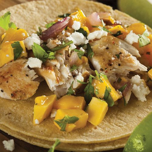 - Assemble tacos with fish, mango mixture, drizzle of spicy ranch, crumbled cheese, and lime wedges. Serve immediately.
