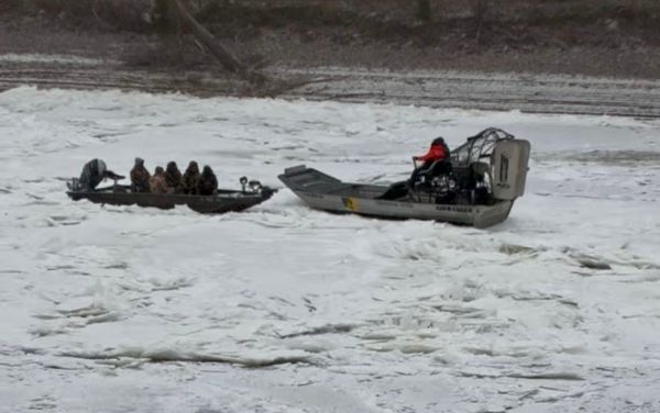Under weather conditions of 12 degrees and snow, with that area of the river nearly frozen from bank to bank, officers deployed an airboat, reached the hunters, and brought them safely to shore.