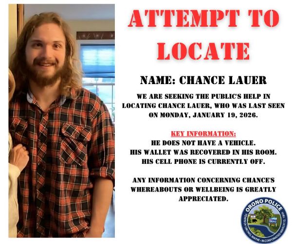 Chance Lauer, age 19, was last seen on Monday, January 19th at the Orchard Trail Apartments in Orono where he lives. Lauer is 5'8" tall and weighs approximately 160 pounds. He has brown hair and hazel eyes. Anyone with any information regarding Chance Lauer is encouraged to call the Maine State Police dispatch at 207-973-3700.