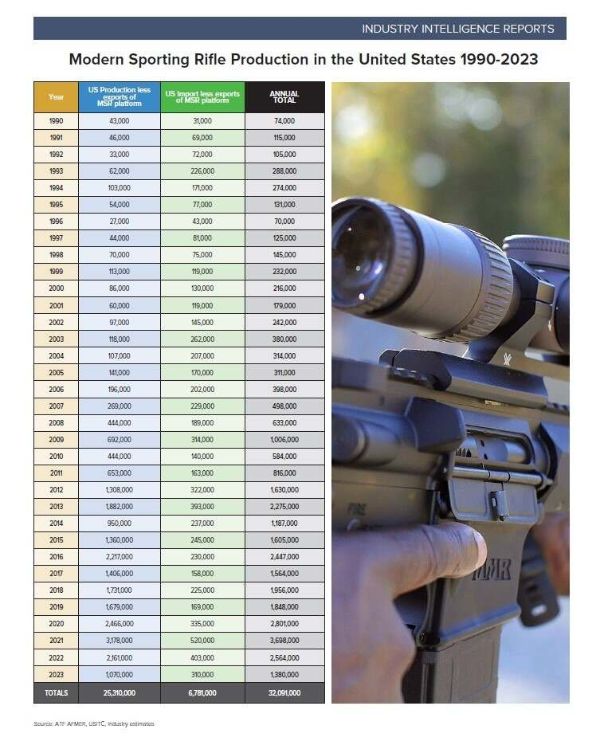 - Data indicates that 32,091,000 Modern Sporting Rifles (MSRs) are in circulation since 1990.