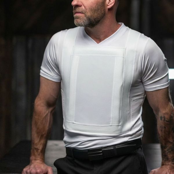 The Everyday Armor T-Shirt has built a loyal following among professionals and prepared citizens who need low-profile ballistic protection that fits into daily life. The new V-neck option is designed to stay hidden under a button-down, polo, uniform shirt, or suit jacket while keeping the armor positioned for proper coverage of the cardiac box.