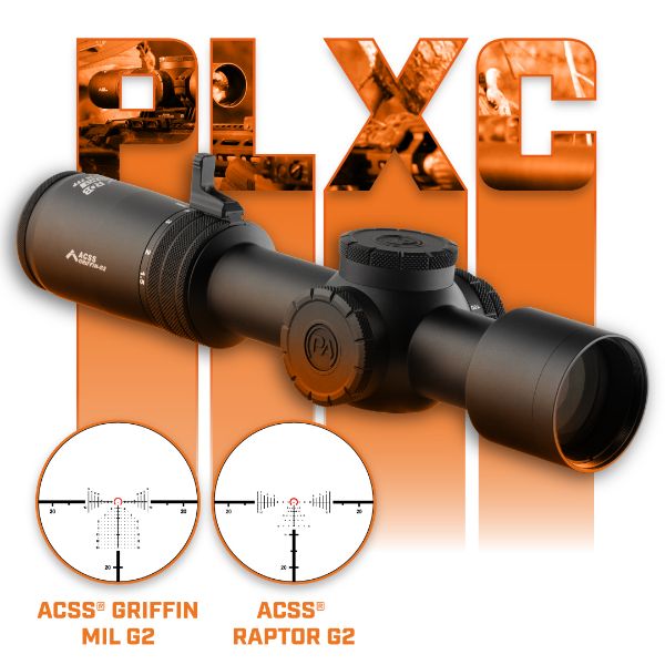 The PLx Compact 1.5-12x36 FFP RDB will be offered with two ACSS® reticle options. The ACSS Raptor 5.56 Yard G2 reticle is calibrated for 5.56, .308 and similar cartridges, combining a proven BDC system with a true Red Dot Bright® horseshoe and chevron, full ranging stadia, wind holds and moving target leads. The ACSS Griffin MIL G2 reticle provides a MIL-based grid with an illuminated chevron center, allowing for rapid acquisition at low magnification and precise holds and ranging at higher power without dialing turrets. Both configurations are designed to deliver fast, intuitive engagements across a wide range of distances.