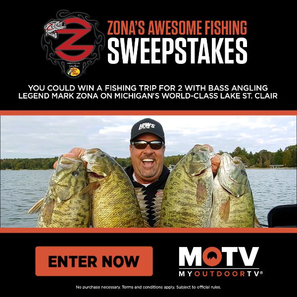 Enter Now to Win "Zona's Awesome Fishing Sweepstakes" Presented by MyOutdoorTV. Here's your chance to win a dream fishing trip for two with legendary bass fisherman Mark Zona in "Zona's Awesome Fishing Sweepstakes" presented by MyOutdoorTV. Running now through March 8, this one-of-a-kind sweepstakes offers a grand prize that's every angler's dream – a day on the water with pro fisherman and TV personality Mark Zona, and on a fishery Zona knows best – renowned Lake St. Clair, Michigan. To enter, visit www.myoutdoortv.com/zonasweeps.
