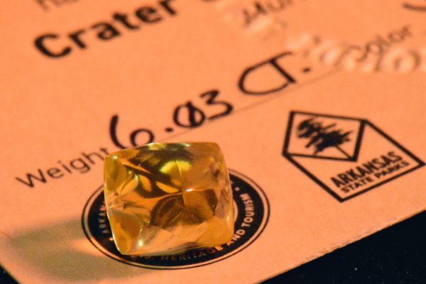 Another well-known diamond from the park is the Strawn-Wagner. Found in 1990 by Murfreesboro resident Shirley Strawn, this 3.03-carat white gem was cut into a round brilliant shape weighing 1.09 carats. It graded as ideal cut, D-colorless and flawless and was set in a platinum and 24-carat gold ring. In 1998, the state of Arkansas purchased this diamond for $34,700 in donations and placed it on permanent display at the park visitor center.