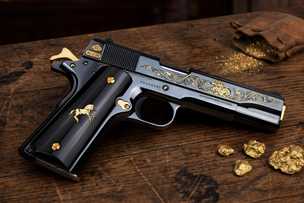 The top of the slide sits a portrait of Joaquin Murrieta, with name and birth-to-death year in 24k gold. Towards the back, there is a depiction of the Mexican eagle for its era. The frame, slide, barrel and hardware are all highly polished and feature 24k gold in select areas, and controls in a deep Colt Royal Blue finish. 24k gold plating is selective on this commemorative, complete with a gold Colt Rampart medallion inserted into presentation-grade Kirinite grips.