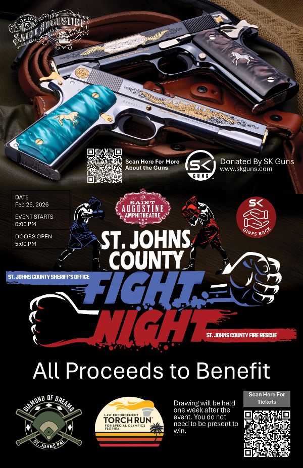As part of its sponsorship, SK Guns will raffle two exclusive non-retail SK Customs St. Augustine Colt 1911 pistols. These one-of-a-kind firearms showcase intricate engravings that pay homage to the rich history of St. Augustine. Proceeds from the raffle will benefit Diamond of Dreams for the Police Athletic League (PAL) and Special Olympics Florida, organizations dedicated to enhancing the lives of children with special needs and local athletes with intellectual disabilities. Anyone can participate in the raffle, and you do not need to be present to win! See attached flyer for more information.