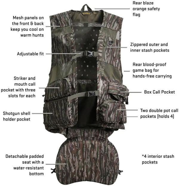 Strategic Compartmentalization: Purpose-built pockets keep box calls, pot calls, strikers, mouth calls, shells, and accessories organized and easy to access. The vest features dual elongated zippered pockets for locators and a dedicated vertical chest pocket for secure smartphone storage.