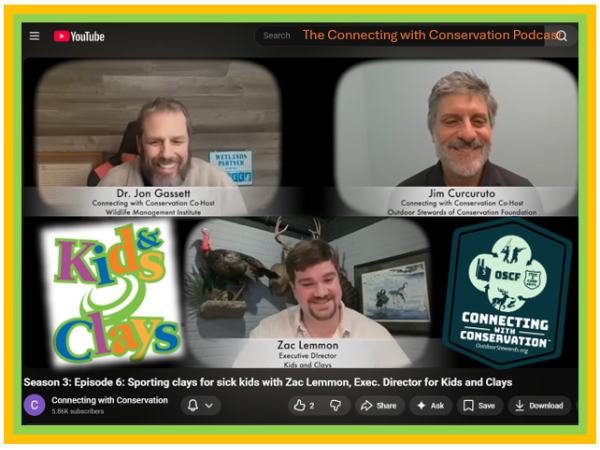 The Connecting with Conservation (CWC) Podcast is proud to welcome Kids & Clays Foundation Executive Director Zac Lemmon as a recent guest. In this episode, Lemmon joins hosts Jon Gassett of Wildlife Management Institute (WMI) and Jim Curcuruto of Outdoor Stewards of Conservation Foundation (OSCF) for an inspirational discussion on how gun owners and the shooting sports community support youth in need.