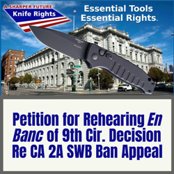 Knife Rights and its fellow appellants have filed a petition for rehearing En Banc (the full court) of the twisted decision by the Ninth Circuit Panel in their lawsuit challenging California's ban on switchblade (automatic) knives with a blade 2 inches and greater on Second Amendment grounds.