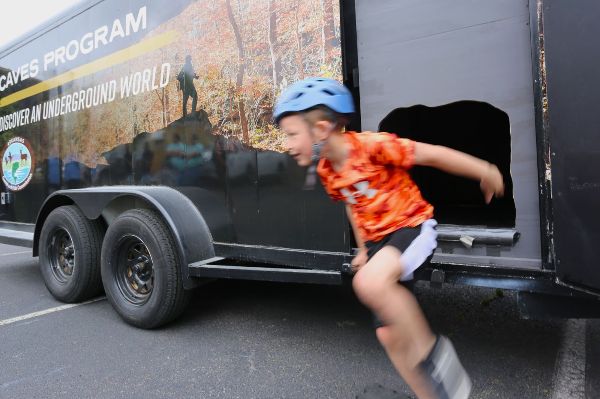 The back of the trailer opens to reveal a small tunnel opening at the floor level. "Spelunkers" are given a helmet, gloves and a light before they began the crawl, which runs the length of the trailer, turns, doubles back, and includes a quick climb and a short drop. The exit, at the bottom of the front of the trailer, allows explorers to get their feet back on solid ground. The experience is suitable for students K-12 and anyone else who feels adventurous and is limber enough.
