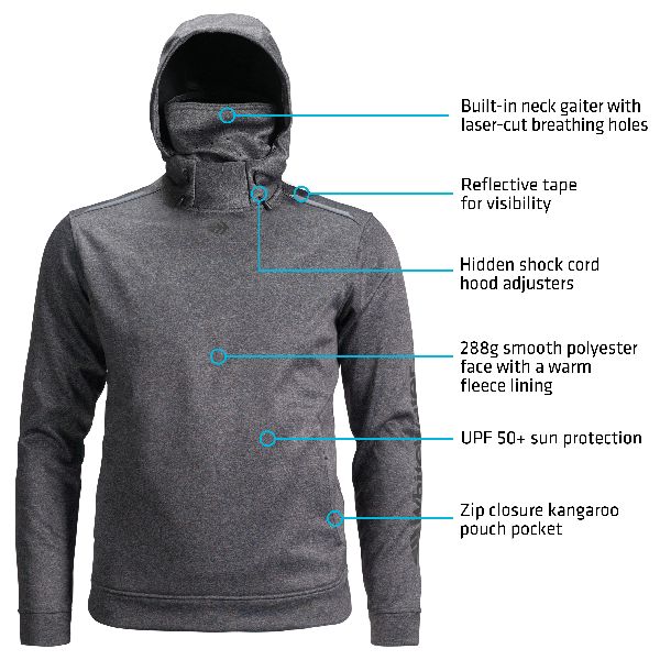 The Beacon's technical signature is purpose-built for running the lake or coast. While standard hoodies become a sail in a 50-mph boat ride, the Beacon features a three-panel, fitted hood with a rear pass-through vent. This allows wind to escape, neutralizing pressure and anchoring the hood firmly in place. This is complemented by an integrated stealth gaiter. Built directly into the collar with laser-cut ventilation, it provides instant concealment and UPF 50+ protection from wind and sun without the need for extra, loose gear that can get lost in the shuffle.