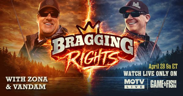 MyOutdoorTV (MOTV) and GAME & FISH TV invite viewers to join in Tuesday, April 28, from 9:00 a.m. to 12:00 p.m. ET, for "Bragging Rights with Zona and VanDam," the streamers' first ever live head-to-head contest between high-powered anglers Mark Zona and Kevin VanDam.