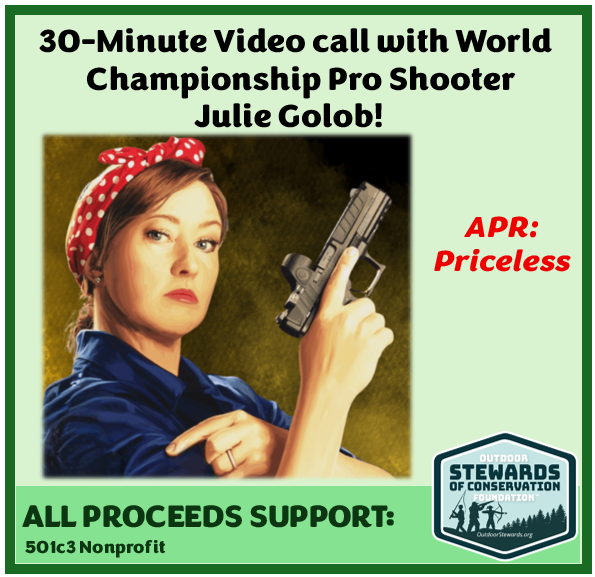 - BONUS: The high bidder of this auction will receive a 30-minute video (i.e., Zoom) call with World Championship professional target shooter Julie Golob. Boasting over 175 championship titles, Golob will help the winner learn about the auction items, give shooting tips and answer any questions. (ARV: Priceless)