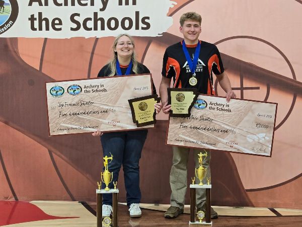 Magnet Coveβs Holly Chandler and Cash Hignight show off their $500 Arkansas Game and Fish Foundation scholarship checks. Both archers took home individual first-place honors in the High School Girls and Boys divisions, respectively.