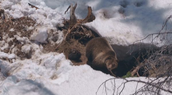 A female grizzly bear that was translocated two years ago from the Northern Continental Divide Ecosystem (NCDE) in Montana to the Greater Yellowstone Ecosystem (GYE) in Wyoming was recently seen and photographed with cubs at her den site during a radio-telemetry monitoring flight.
