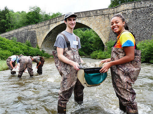 Students observe stream wildlife at Casselman River Bridge State Park during the 2017 Natural Resources Career Camp.