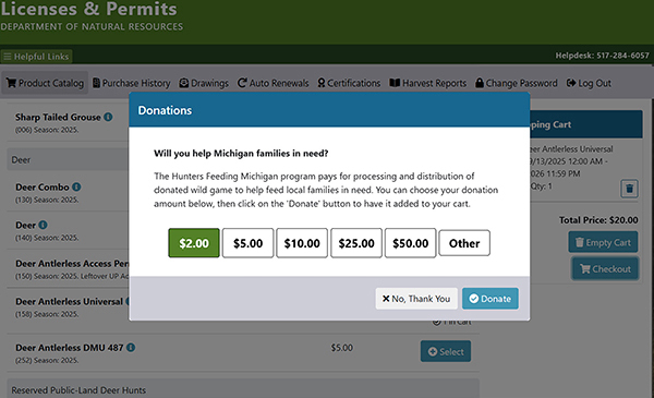 The DNR urges outdoor recreationists, when purchasing their licenses or permits, to consider adding a monetary donation to Hunters Feeding Michigan.