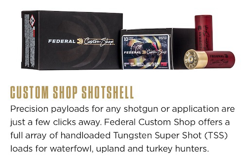 “Launched in the fall of 2019, the product line in our Federal Custom Shop continues to grow,” said Federal Shotshell Product Manager Josh Vickers. “This year, we have added several options of Tungsten Super Shot (TSS) with hefty payloads to deliver maximum pellet counts. These are the types of ultra-heavy payload shotshells that we can’t load on our factory machines effectively and efficiently. They really can only be built as handloads, so we are happy to offer them as Custom Shop offering.”