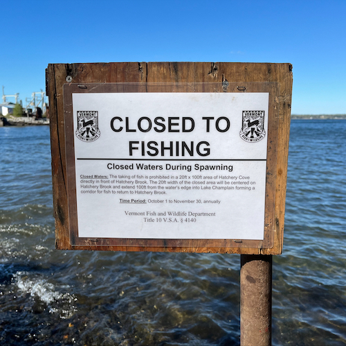 The closure aims to provide a safe corridor for the landlocked Atlantic salmon that gather in Hatchery Cove before migrating up the nearby Hatchery Brook to spawn each fall. The closed corridor is a 20 ft. x 100 ft. area of cove directly in front of Hatchery Brook, centered on the brook and extending out from the water’s edge into Lake Champlain. The corridor area has been clearly marked with signs in the field.