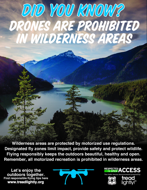 “The Forest Service wilderness program wanted to develop these educational pieces to address the growing popularity of using drones on public land,” said Sandra Skrien, National Wilderness Program Manager of the U.S. Forest Service. “As the drone community grows, we want to take a leadership role in addressing important recreation issues to help minimize impact and protect wildlife.”