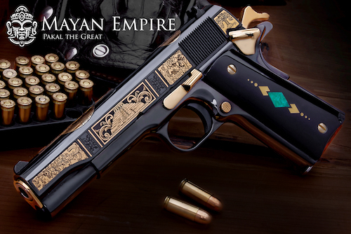The left and right sides of the pistol's slide are adorned with engraved pyramids, bordered in 24k gold, accompanied by scrollwork depicting Mayan beliefs, hieroglyphics and shaded textile patterns. The top of the slide features representations of Pakal the Great, additional hieroglyphics and the Mayan calendar.