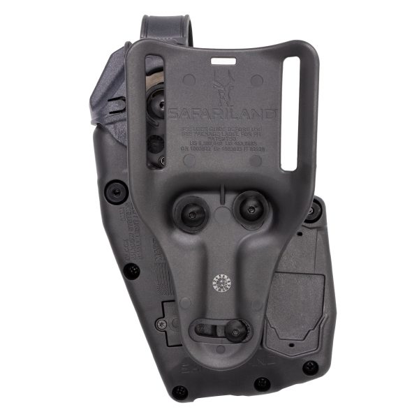 SafariVault’s improved ALS™ design reduces flex and increases crush resistance. Internal locking components protect the security devices from impact and the elements. SafariVault’s all-new self-clearing optic cover accommodates closed and open emitter pistol optics. The new trigger guard stabilization mechanism prevents movement of the weapon within the holster. SafariVault’s open muzzle design provides clearance for threaded barrels or compensators and allows debris or brass to pass through.