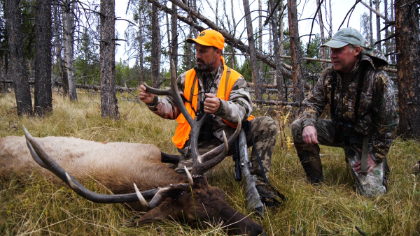 Continuing on with his hunt, Doug gets a whiff of musk in the air as he walks through a thick area of conifers and hears the sounds of bugling nearby. Realizing his patience has led to a promising opportunity, a Rocky Mountain Bull Elk comes into range. Stay tuned as these two exciting hunts come together.