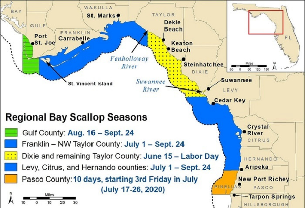Recreational bay scallop season for Franklin through the northwestern portion of Taylor County, as well as Levy, Citrus and Hernando counties opens July 1 and will remain open through Sept. 24. This includes Carrabelle, Lanark, St. Marks, Cedar Key, Crystal River and Homosassa.